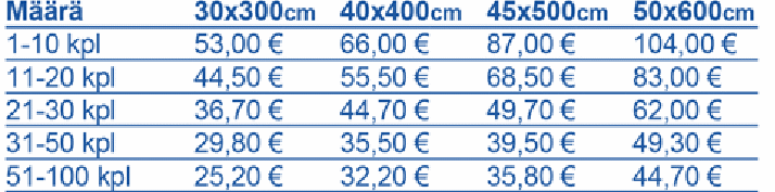 Hinnat ja koot ovat seuraavat: